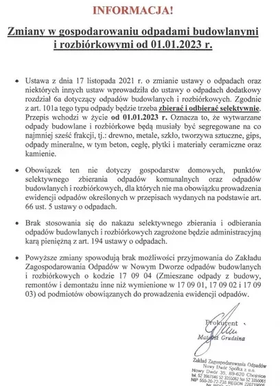 Zakład Zagospodarowania Odpadów Nowy Dwór Sp. z o.o. informuje, iż w uchwalonej ustawie z 15 grudnia 2022 roku o szczególnej ochronie niektórych odbiorców paliw gazowych w 2023r. w związku z sytuacją na rynku gazu, znowelizowano m.in. zapisy paragrafu 19 ustawy z 17 listopada 2021 r. o zmianie ustawy o odpadach oraz niektórych innych ustaw. Oznacza to, że przesunięty zostanie z 1 stycznia 2023 r. na 1 stycznia 2025 r. […]