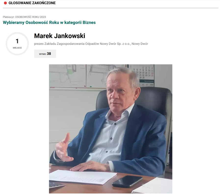 Z dumą i radością informujemy, iż Pan Marek Jankowski Prezes Zakładu Zagospodarowania Odpadów Nowy Dwór Sp. z o.o. zajął 1 miejsce w plebiscycie do tytułu Osobowość Roku 2023 w kategorii Biznes w powiecie chojnickim. Plebiscyt został zorganizowany przez Kolegium Redakcyjne „Dziennika Bałtyckiego” i „Głosu Pomorza”. Nominacja została przyznana za przeprowadzenie wielomilionowej inwestycji polegającej na budowie nowej sortowni odpadów.