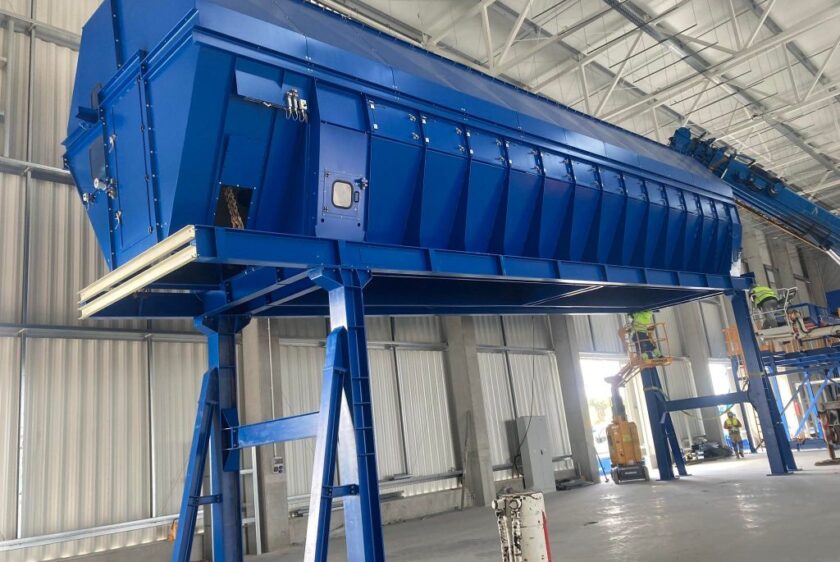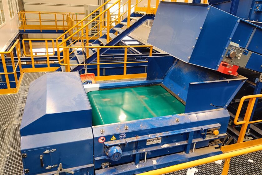 <p>Frakcja 40 – 340, otrzymywana po przejściu odpadów przez sito bębnowe, kierowana jest na separator metali żelaznych. Materiał, który urządzenie odseparuje, podawany jest do kabiny sortowniczej metali. Pozostały materiał jest kierowany na separator wiroprądowy. Urządzenie to działa na zasadzie prądów wirowych. Wytwarzane jest tutaj pole elektromagnetyczne. Metale nieżelazne zostają odepchnięte w dalszą część przesypu a …</p>