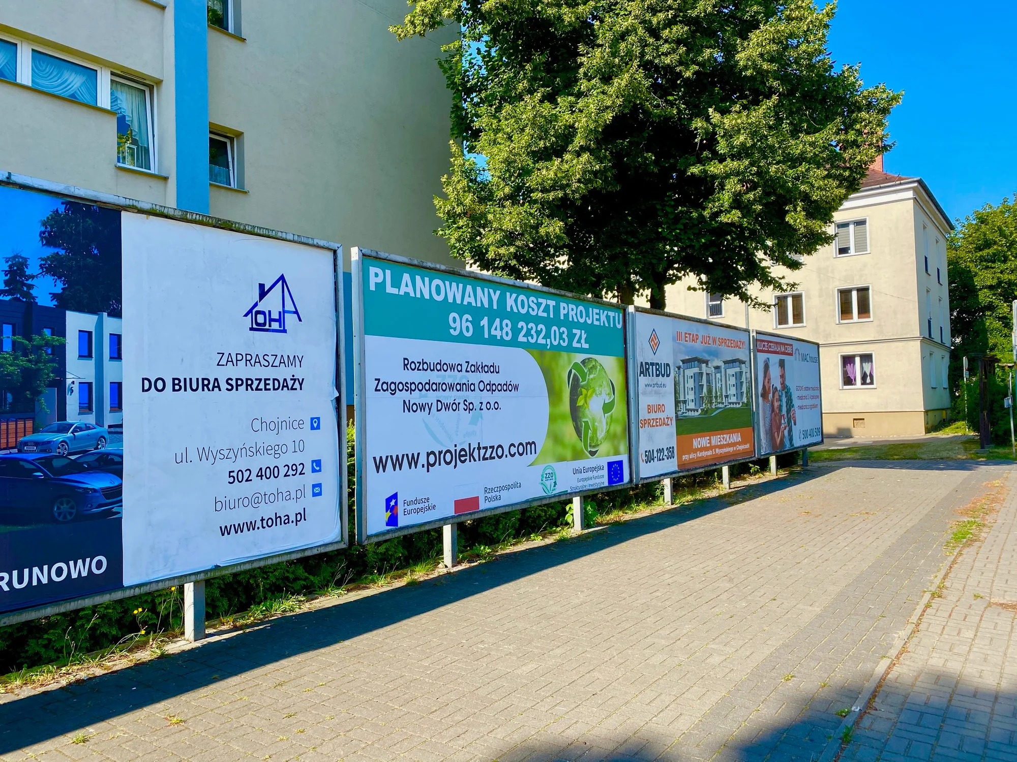 W tych właśnie miejscach w połowie sierpnia pojawiły się banery promujące projekt „Rozbudowa Zakładu Zagospodarowania Odpadów Nowy Dwór Sp. z o.o.”. Poza informacją związaną z dotacją i planowanym kosztem całej inwestycji, banery zawierają również adres strony promującej projekt.